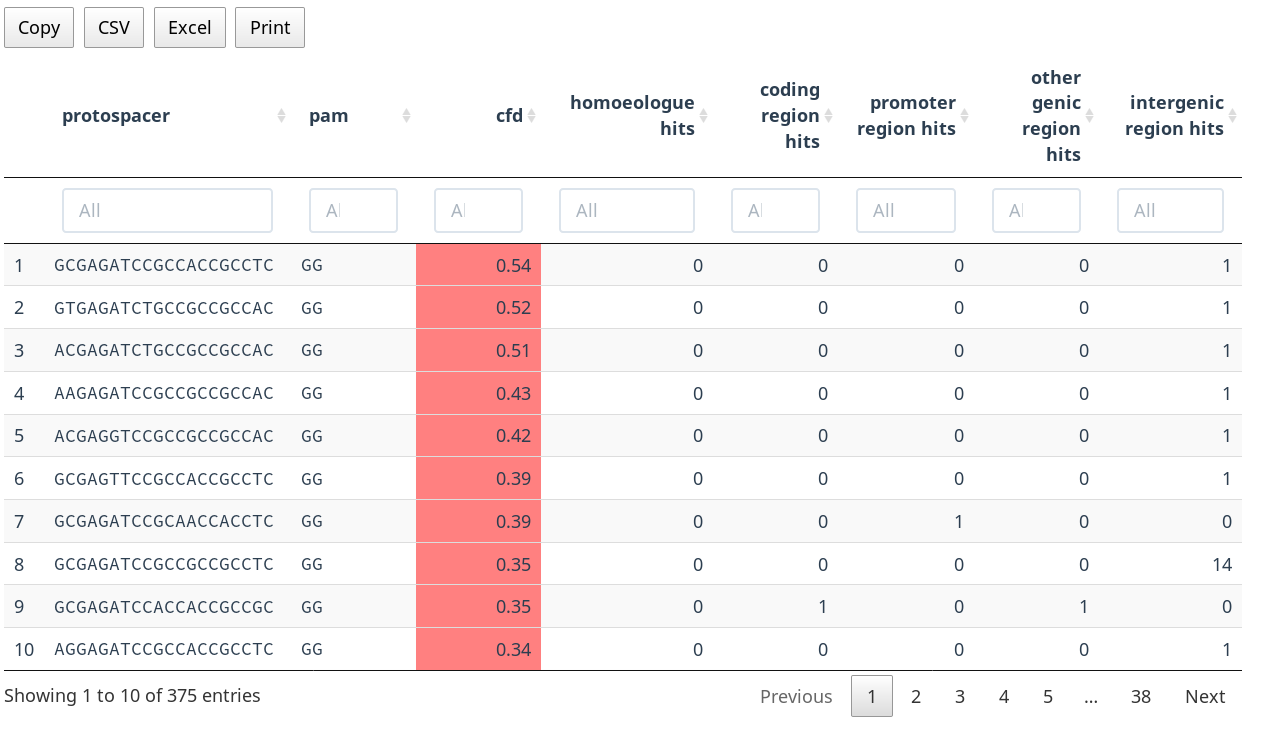 Note that when the "Target Homoeologue" option is enabled that the maximum CFD scores will be adjusted to show the maximum CFD score outside of a homoeologue. That is, the table always shows the "worst" CFD score.