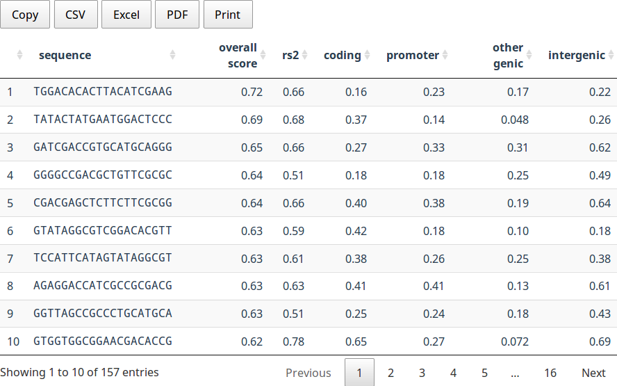 WheatCrispr uses the Doench on-target and off-target scores, along with information about the location of off-target hits (coding, intronic, intergenic, etc.) to produce a single overall score for each sgRNA. By default, detailed information is displayed for the ten highest scoring sgRNAs to facilitate rapid identification of the most likely candidate sequences. An interactive interface allows the user to browse all other sgRNAs if desired.